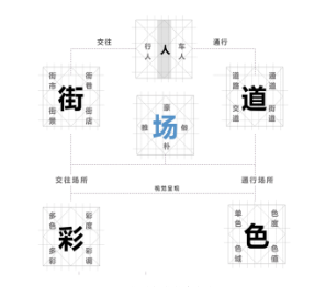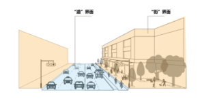 从空间结构维度上将“街道”一分为二,即“街”与“道”。“街”即街市、 街巷。《辞海》定义“街”为旁边有房屋的道路。《管子·五行志》有记载,“街”即“通”。《三苍》将“街”解释为 “街,交道也。” 《说文解字》有云: “街,四通道也。”在现代,“街”是指两侧有房屋、比较宽阔的道路,通常指开设商店的路段。“街”更强调公共活动空间属性,更关注“市井”的界面。人在“街”的场所中交易与交流,是城市中最鲜活的公共空间。“道”即道路,人与车在“道”的场所中通行与通勤,更强调交通的通过性,是城市输送血液的毛细血管。