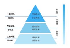 中观维度上营造街道色彩秩序,将街道一分为三,分为三级用色。一级用色传达街道强信息,包括公共交通信息牌、商业体系信息牌、以及少量地标建筑的点缀色。一级用色选用高艳度、高彩度的色彩,小面积点缀使用,与整体环境形成差异,形成视觉焦点。二级用色传达街道中信息,选用中艳度的色彩。二级用色,包括建筑色彩的主色与辅色以及城市家具的用色。三级用色,传达街道弱信息,选用低艳度的色彩,主要包括道路色彩以及自然色彩的营造。(如图4)