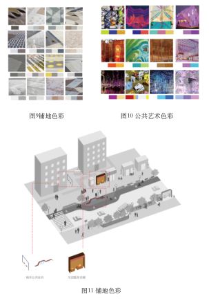 地面铺装的色彩营造,属于街道色彩的三级用色。确定了整个街道环境的基本色调,它可以和建筑物的色彩构成对比或统一。地面铺地的色调多为暖灰色,多为高短调、高中调,运用不同的形状与肌理材质构成,是点线面、形色质的极致应用。(如图9)景观街道空间鼓励采用雕塑等艺术品进行装点,设置喷泉、灯光装置等设施,从而增强空间环境吸引力。在特殊路段和个别节点,可进行特殊设计,运用高艳度、高彩度的色彩,为街道增加色彩和趣味性,丰富视觉体验。(如图10)